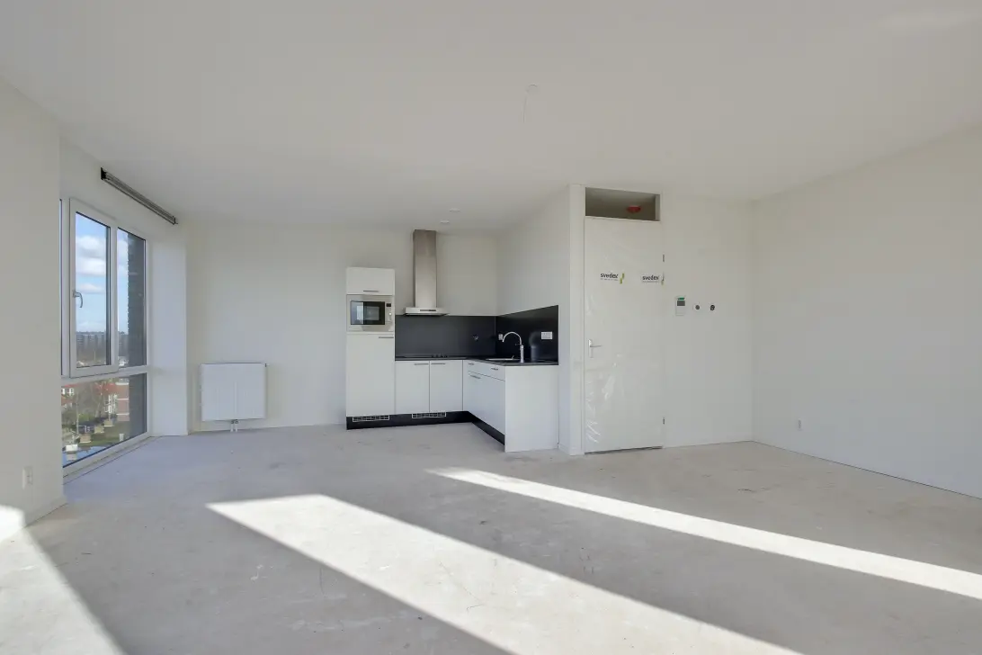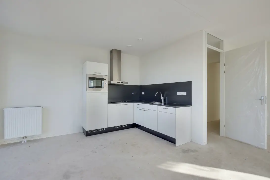 Dit riante appartement is gelegen op de 3e verdieping en heeft een woonoppervlak van 83 m². De woning beschikt over een ruime woon- en eetkamer van 39,6m² met een moderne open keuken voorzien van inbouwapparatuur. Het appartement heeft twee slaapkamers van 16,7 m² en 9,3 m². Via beide van de slaapkamers en de woonkamer is er toegang tot een fijne balkon. De badkamer is voorzien van een douche, toilet en wastafel. In de hal bevindt zich nog een separaat toilet en handige bergruimte.